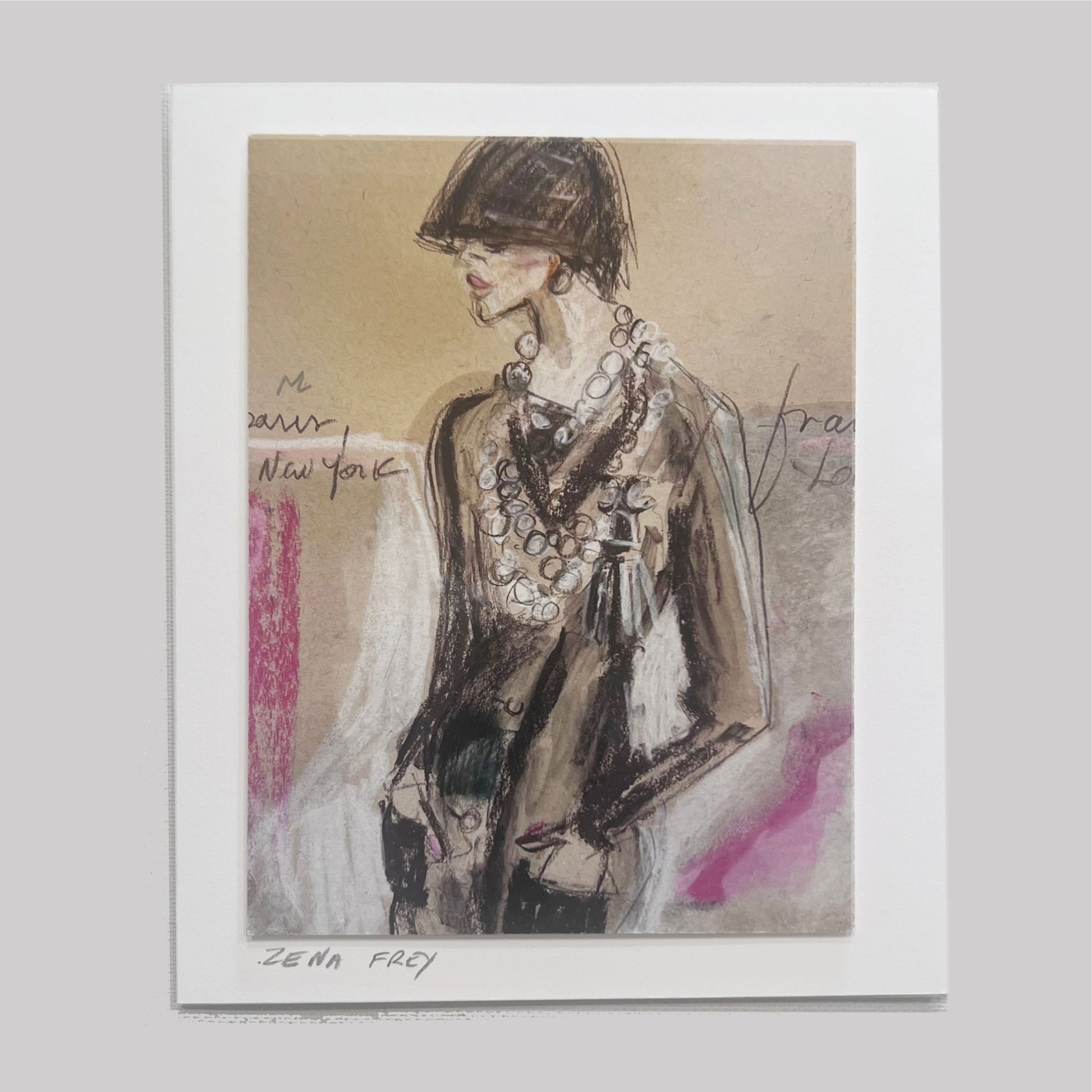 This elegant art card features a hand-drawn fashion illustration with a timeless vintage flair. Rendered in soft tones of charcoal, blush, and cream, the figure is styled in a chic ensemble adorned with layered pearls and a cloche hat — evoking the sophistication of 1920s Paris and New York. Subtle handwritten notes and washes of color add to the artwork’s charm, making it both modern and nostalgic.
