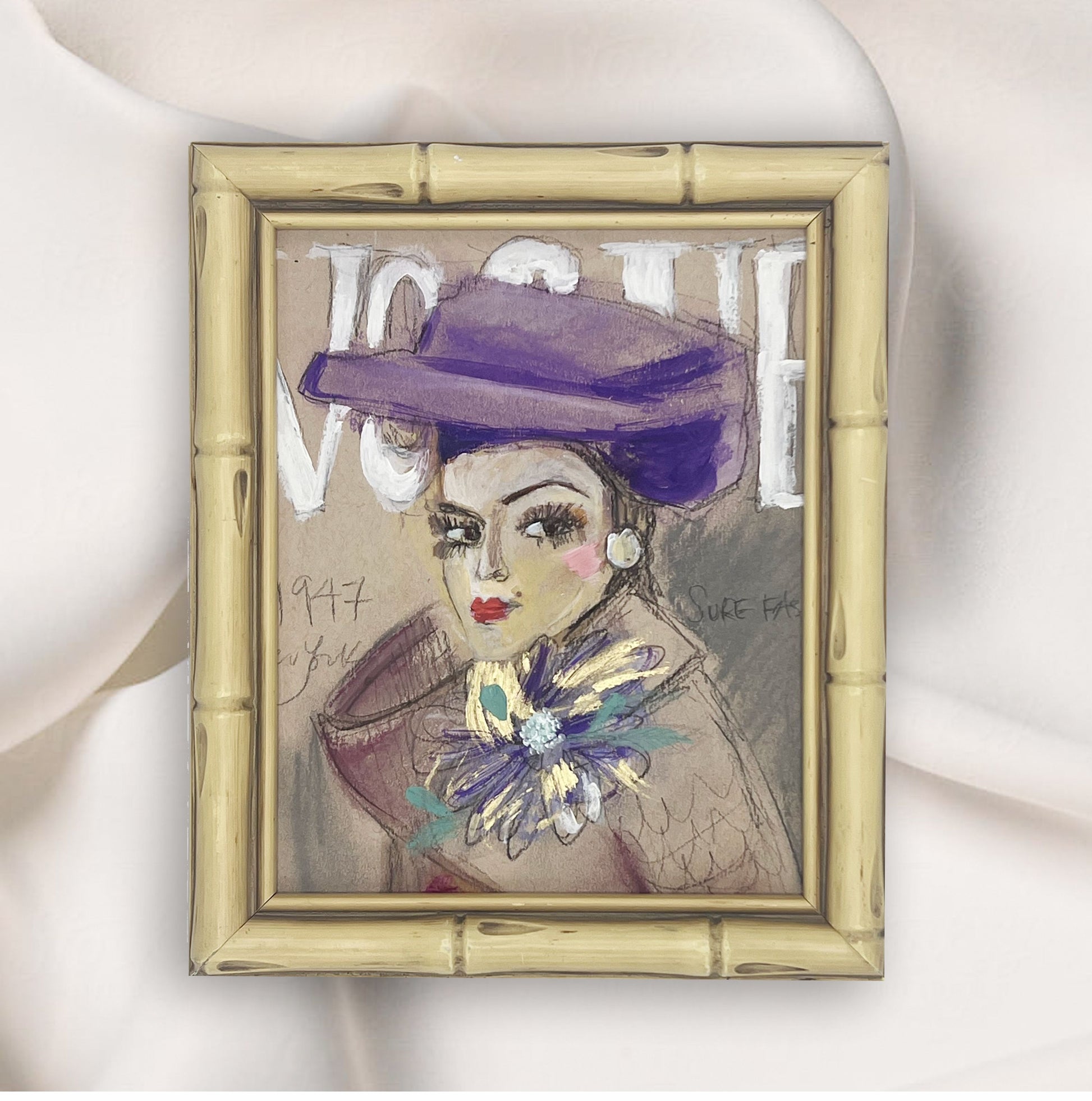 This striking mixed media painting brings high fashion and classic portraiture together in a captivating expression of femininity and style. Painted using a rich combination of acrylics, gouache, and gold leaf paint. Set within a one-of-a kind vintage frame, hand selected from a vintage market, the artwork gains an added layer of history and charm in any room or gallery wall. Piece measures 10 x 11.5