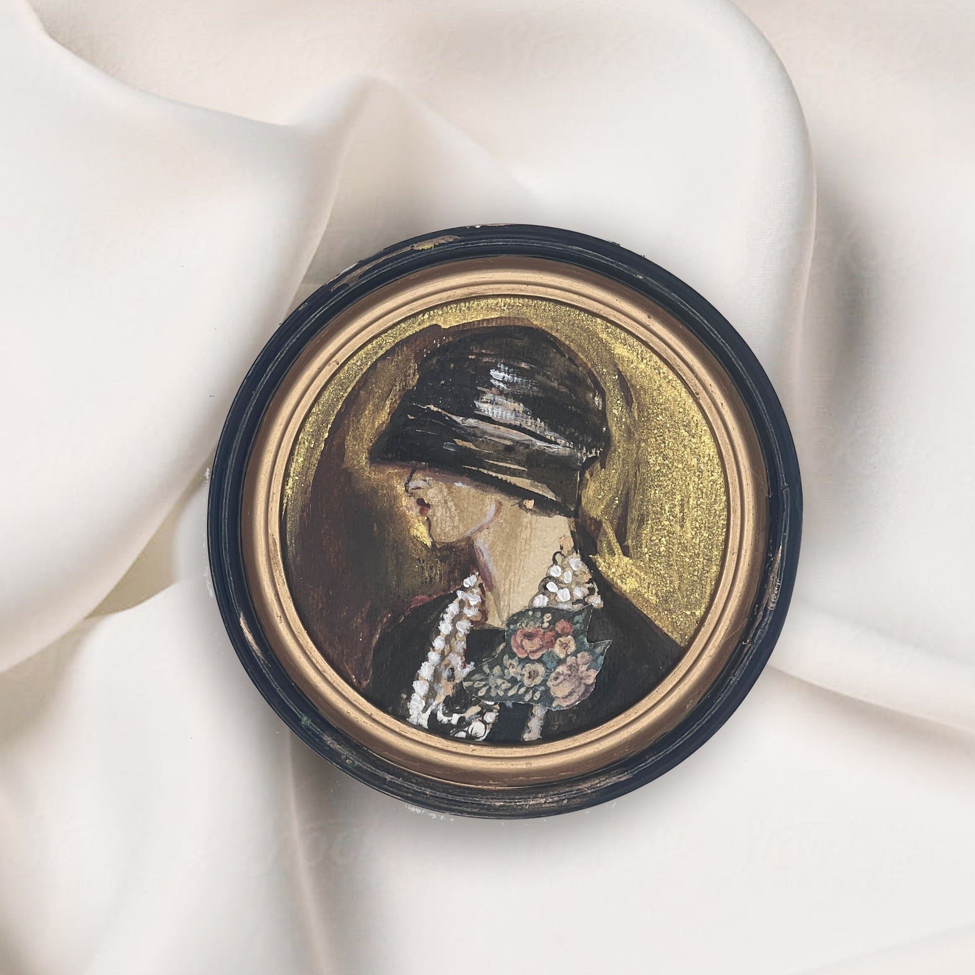Chloe captures the elegant profile of a flapper in 1920"s Paris. Painted in Acrylics and delicate accents of gold leaf, this small but striking portrait exudes the confidence and grace of a bygone era. This piece is set in a beautiful vintage frame 6x6 in size.