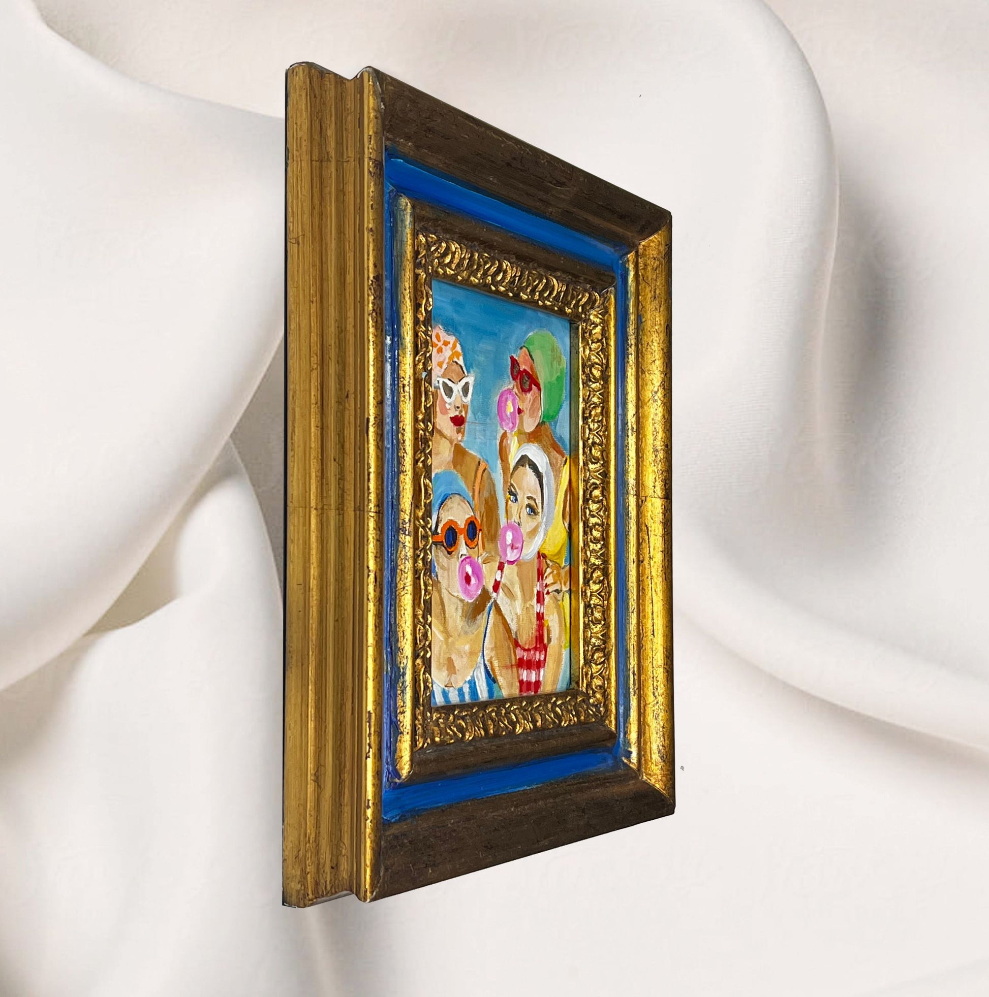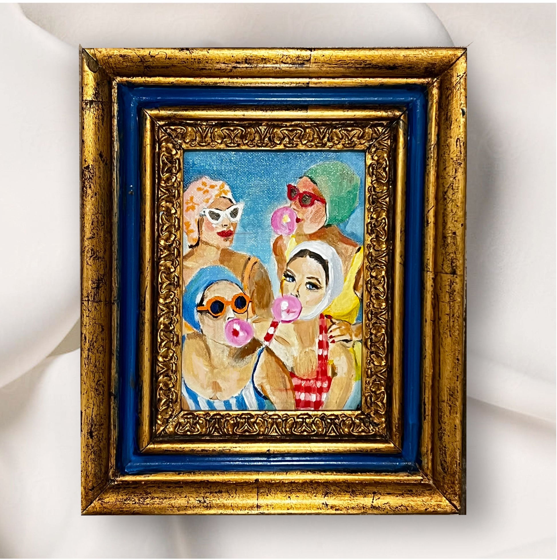 A playful nod to vintage summers, Bubblegum Social Club captures four friends in retro swimwear and cat-eye shades, sharing laughter and bubbles under a bright sky. Painting done on canvas.