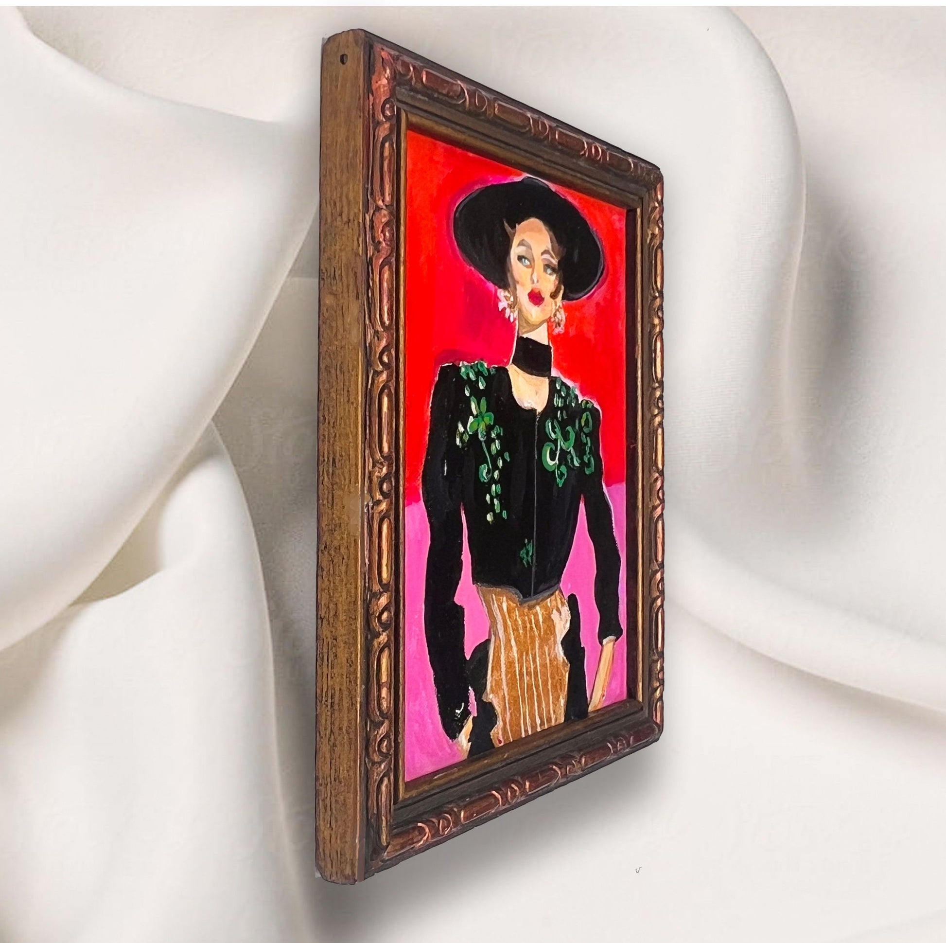 Painted in acrylics and gold leaf she is housed in a beautiful antique frame in a unique bronze color.