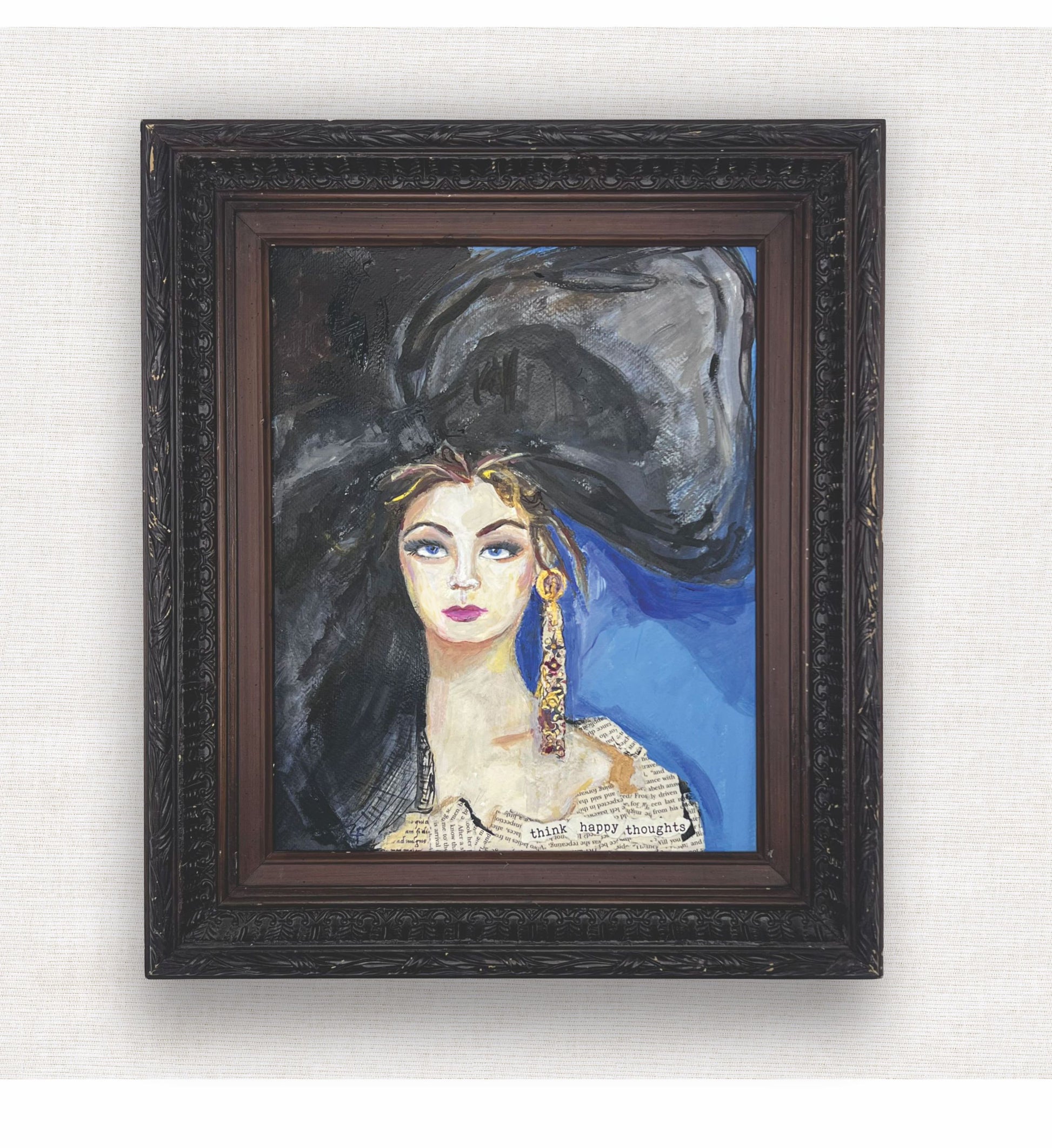 This striking mixed media painting brings high fashion and classic portraiture together in a captivating expression of femininity and style. Painted using a rich combination of acrylics, oils, pastels, gold leaf and a collection of vintage papers. Set within a one-of-a kind vintage frame, hand selected from a vintage market, the artwork gains an added layer of history and charm in any room or gallery wall. Piece measures 18 x 15.5 in Framed