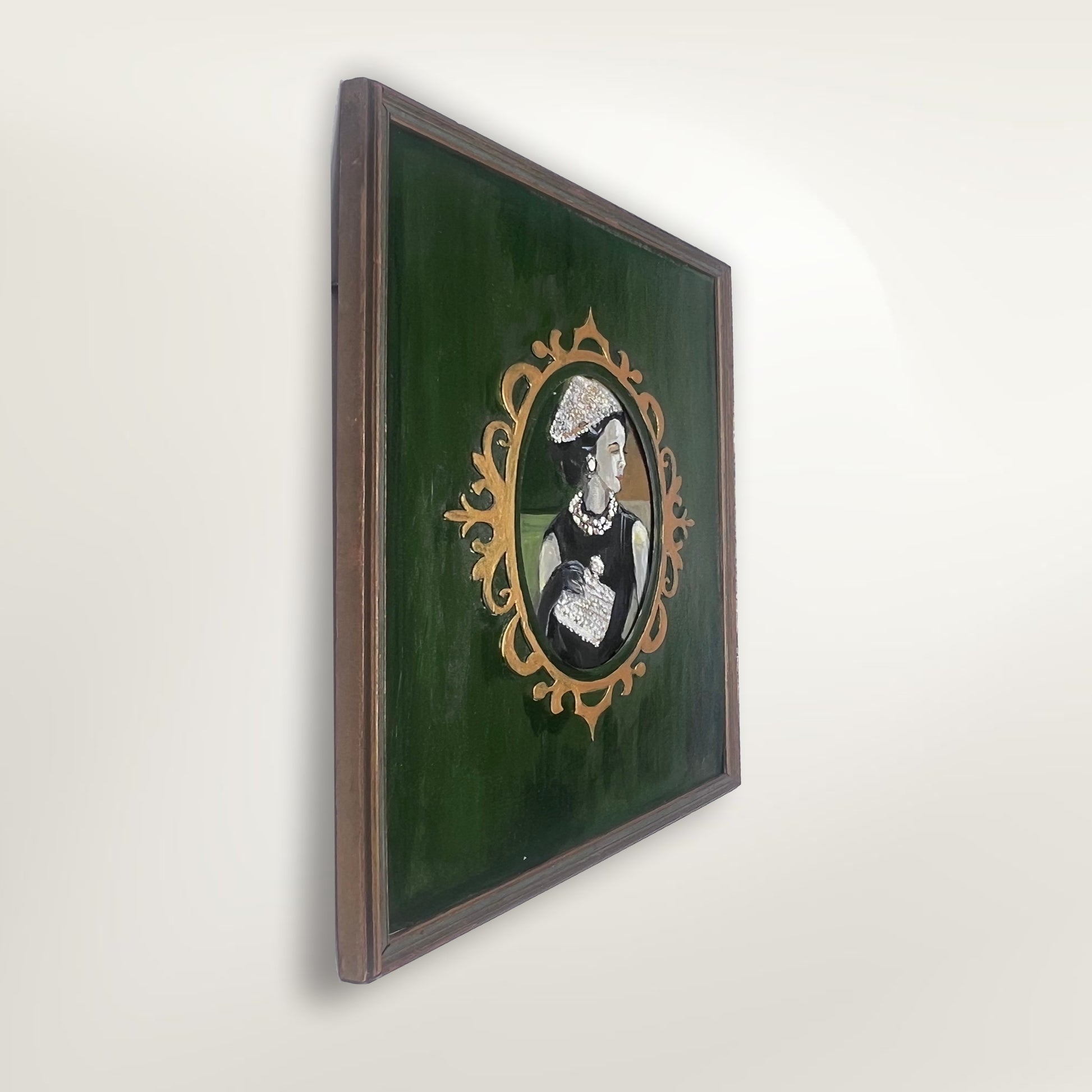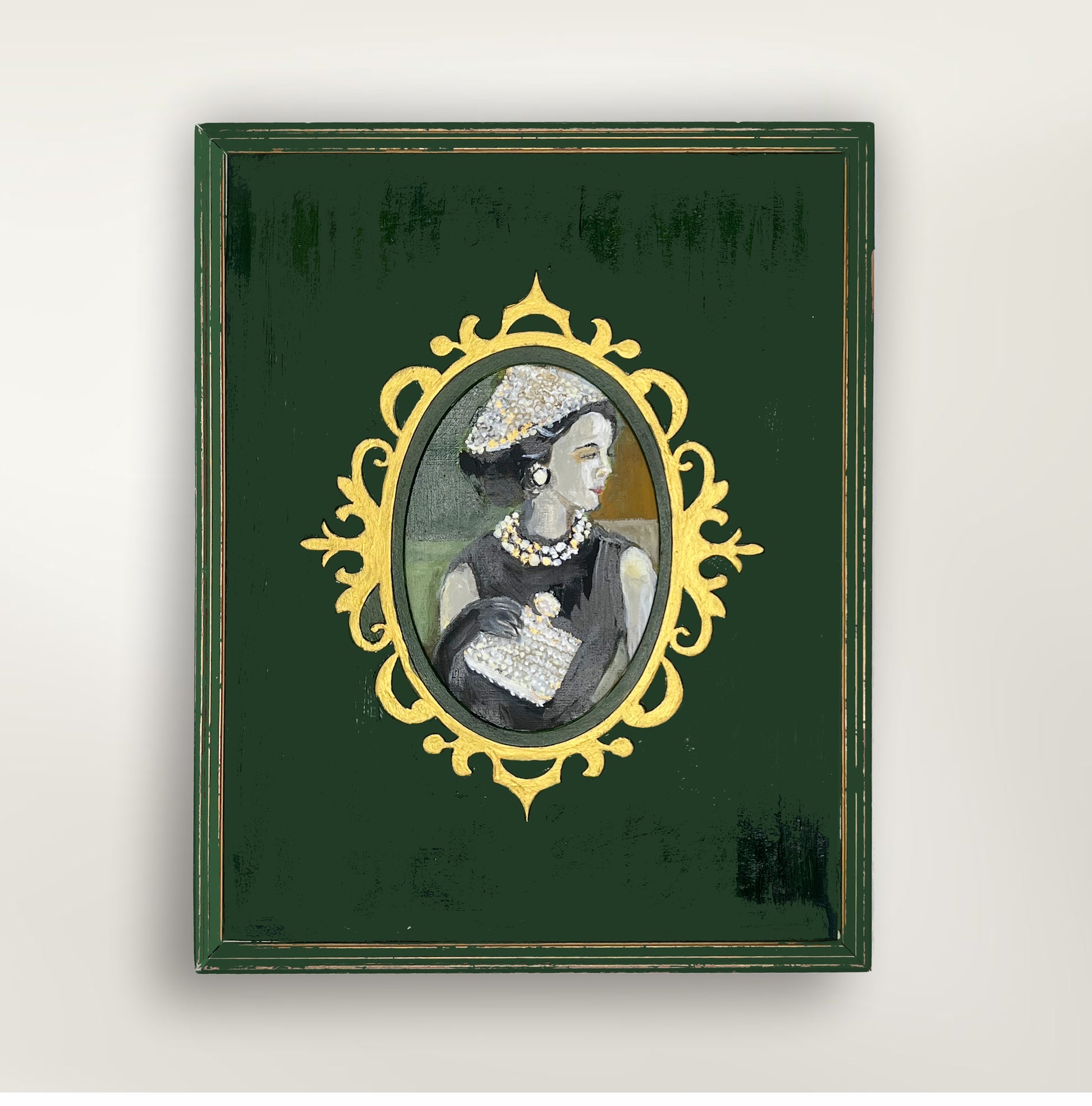 The custom painted mat, in deep green and hand applied gold leaf, was designed to elevate the work, while the vintage frame compliments its timeless glamour.