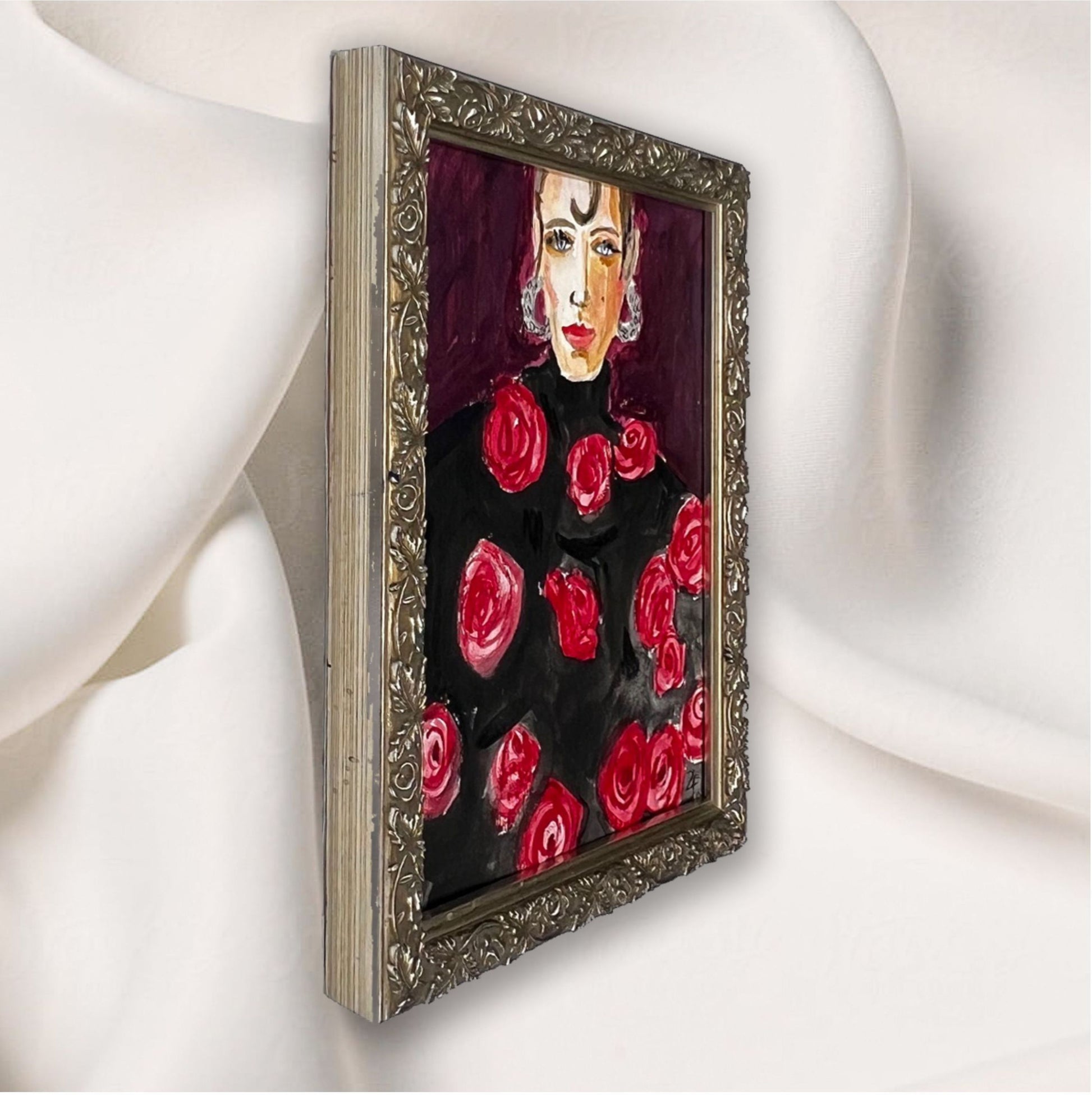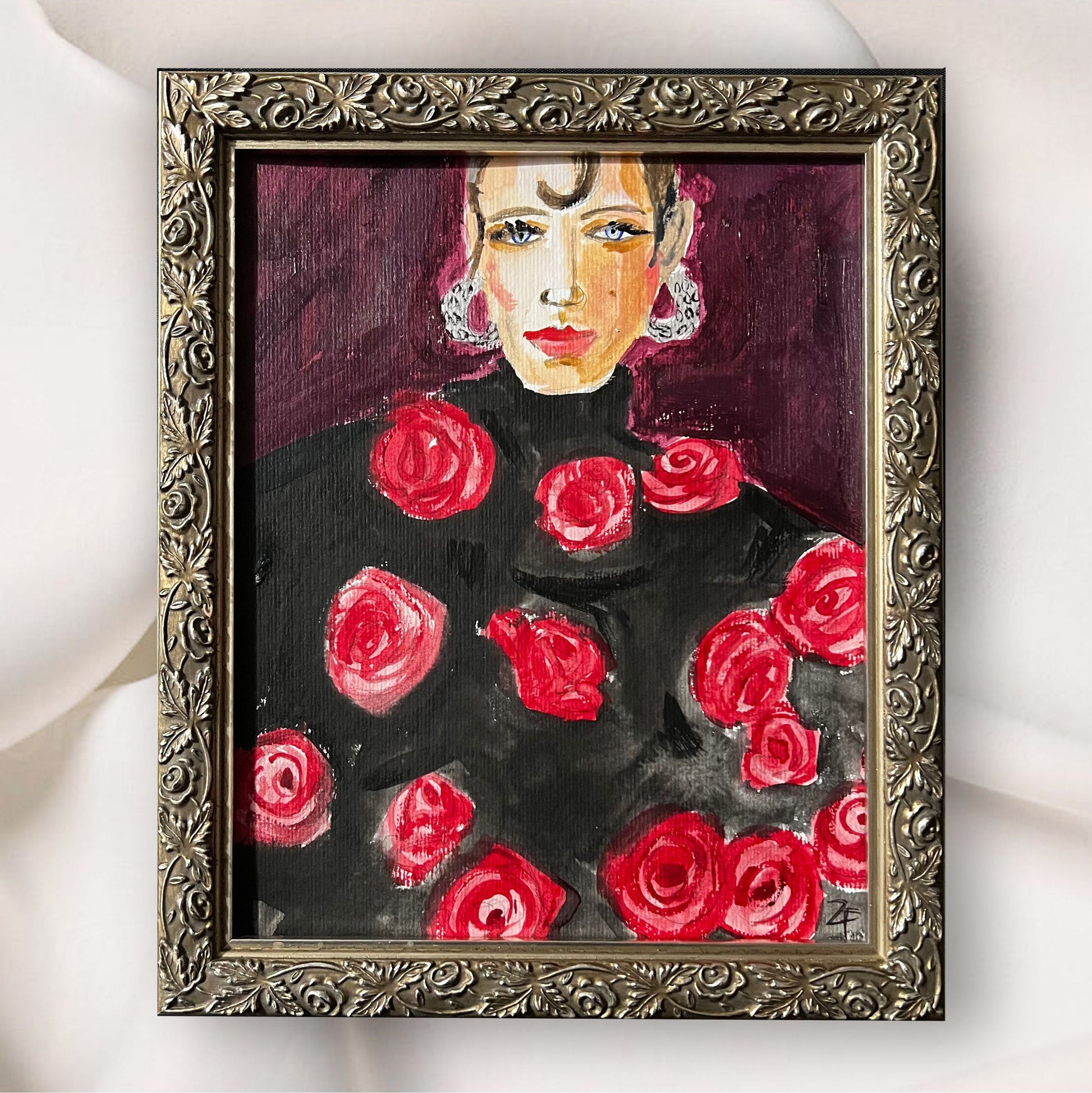 Bold and Elegant Midnight Bloom captures a women wrapped in mystery and strength. Crimson roses bloom across her dark silhouette symbolizing passion and resilience,