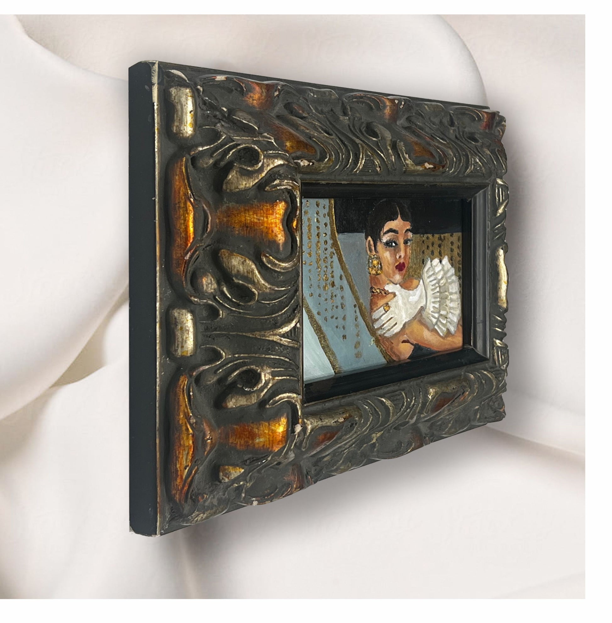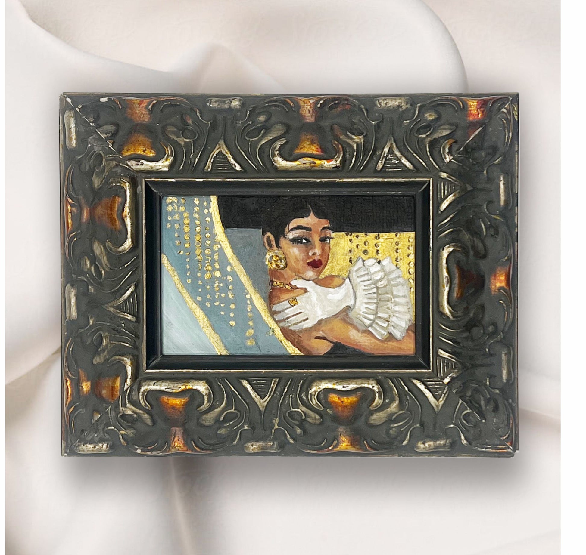 She is sized at 10 x 8 inches . Painted in gold leaf and acrylics and backed with beautiful handmade paper to add a finishing touch on the back of the frame.