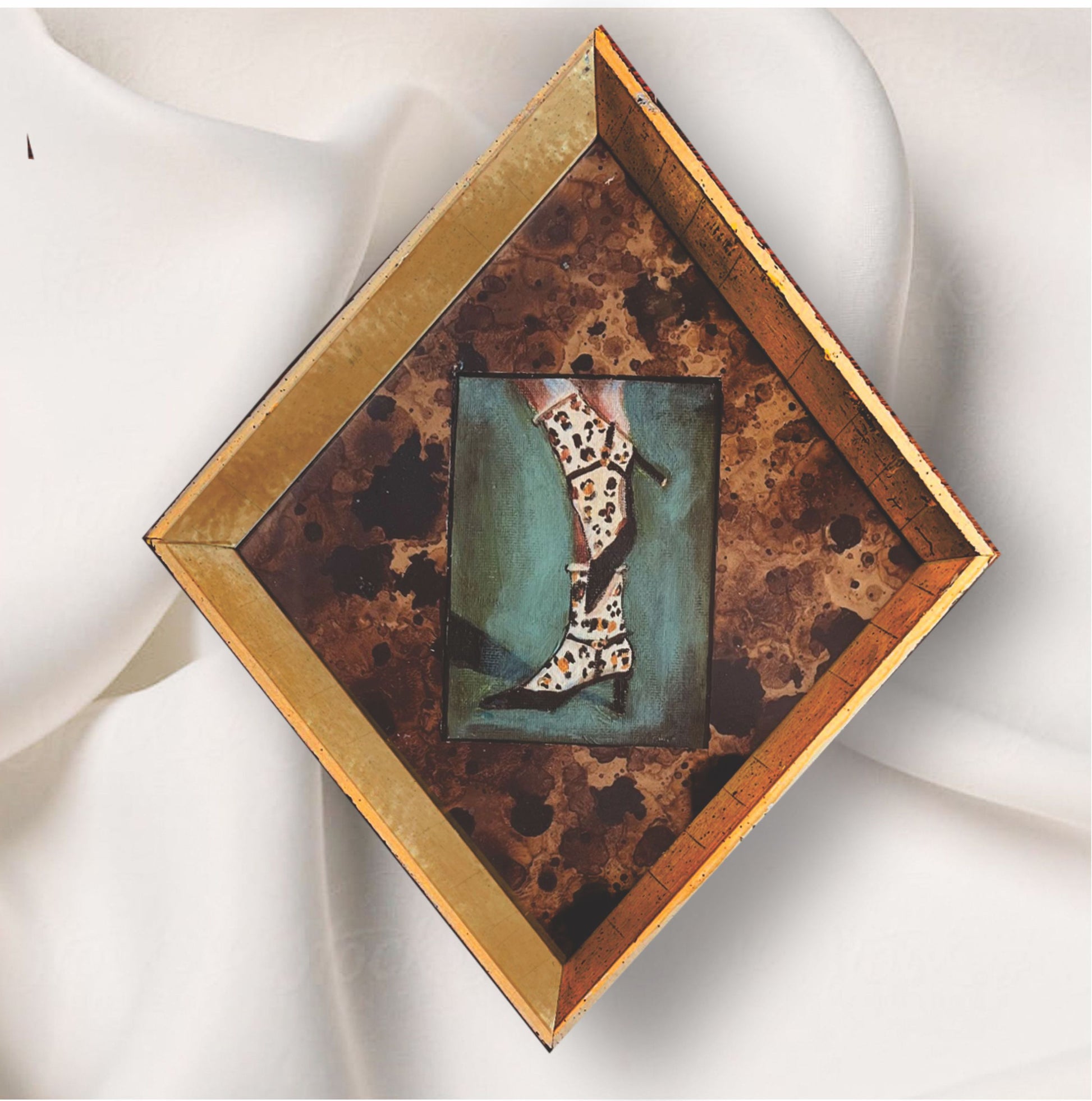 Original painting on canvas, in gold leaf and acrylics. The framing is just as compelling as the art. It was bought in a very special antique shop in Palm Desert.