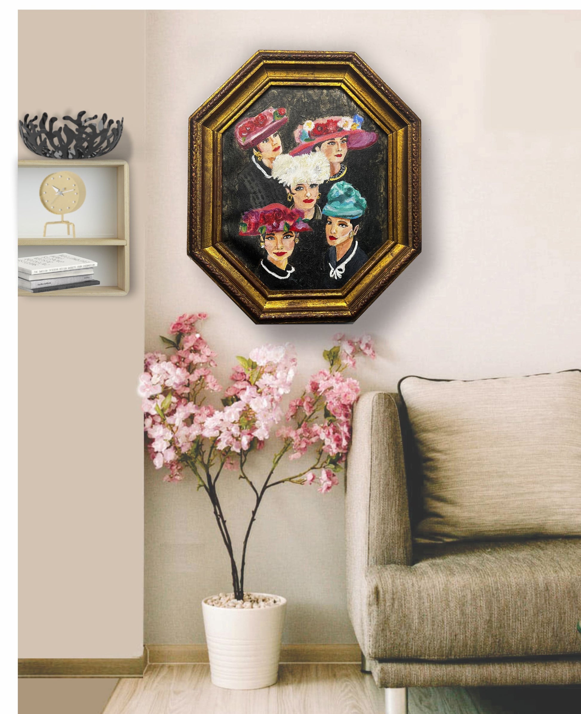 I am so inspired by vintage models wearing hats so I decided to collectively paint them in one painting and embrace them in this beautiful vintage solid wood gold frame I found in Los Angeles, California Antique shop.