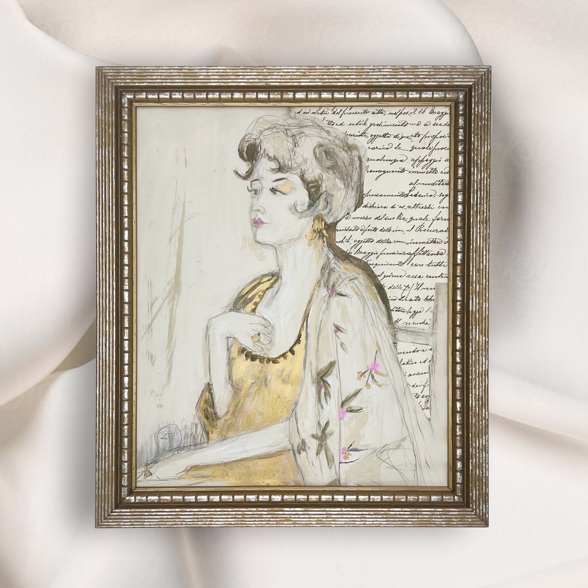 Lucia is named in honor of my beautiful and beloved aunt. I painted her in a New York City studio, inspired by a live model whose elegance and refinement deeply moved me. This mixed media piece combines charcoal, ink, vintage papers and accents of gold leaf adding depth to the piece. She is housed in a vintage frame, measuring 14.5 x 15.5 inches.
