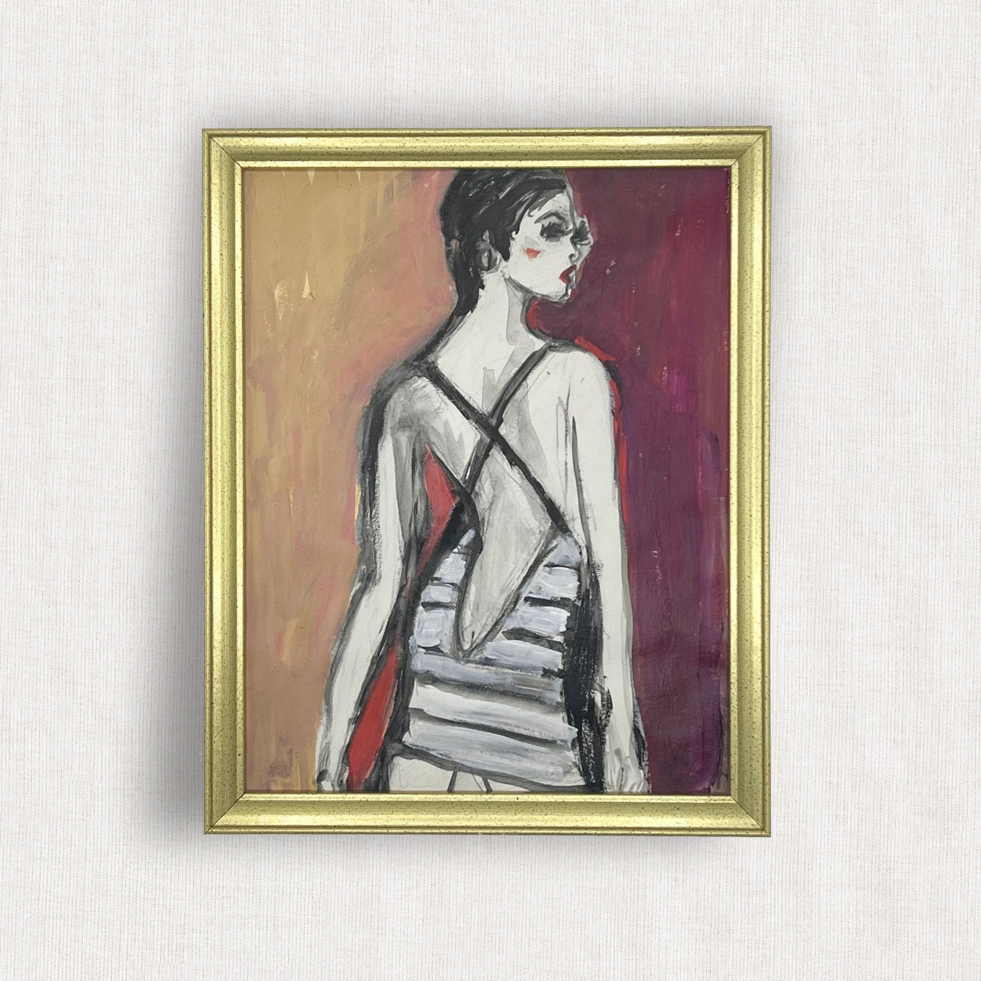 This striking mixed media painting brings high fashion and classic portraiture together in a captivating expression of femininity and style. Painted using a rich combination of acrylics, and gold leaf. Set within a one-of-a kind vintage frame, hand selected from a vintage market, the artwork gains an added layer of history and charm in any room or gallery wall. Piece measures 12 x 9.5 in