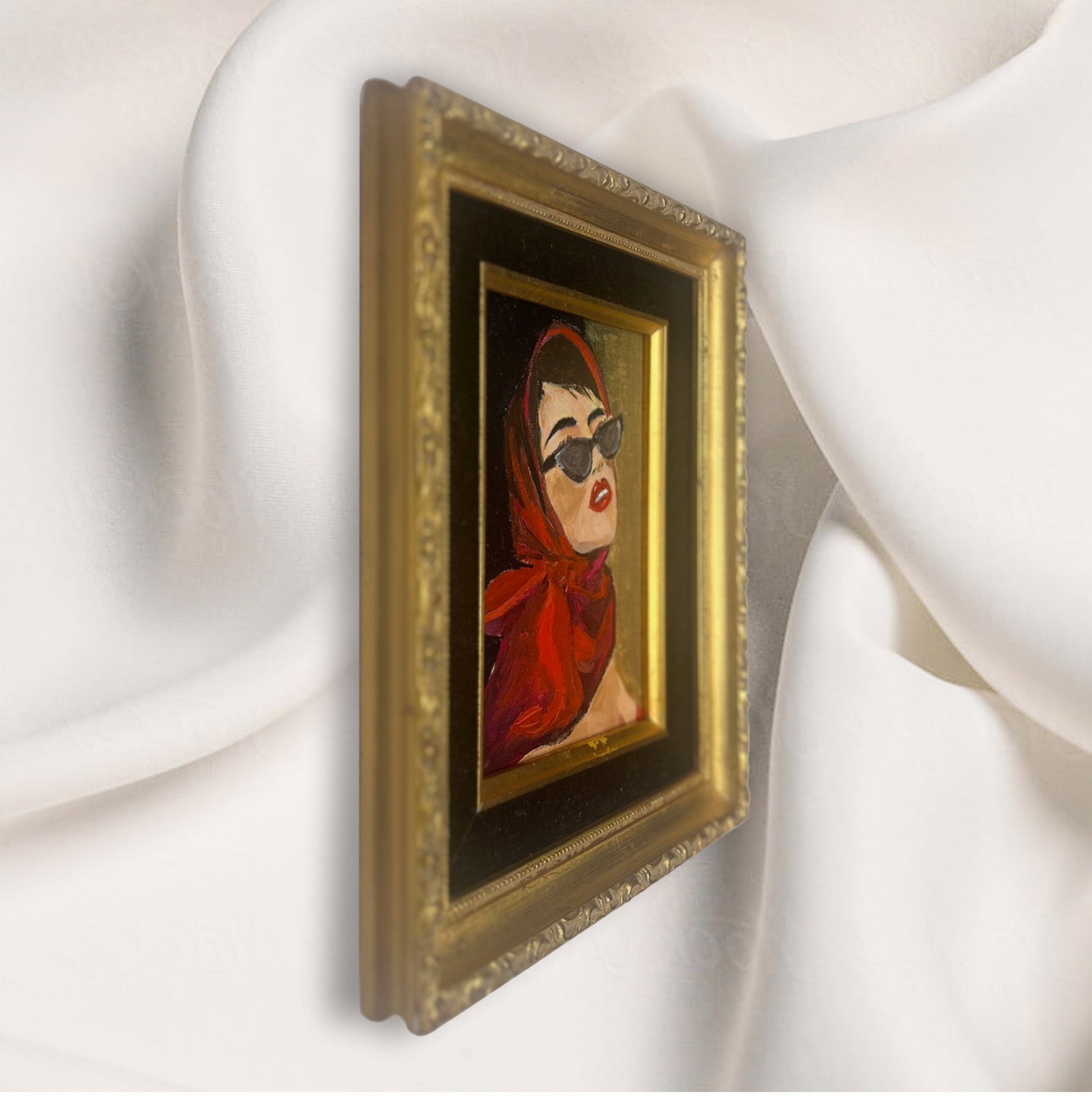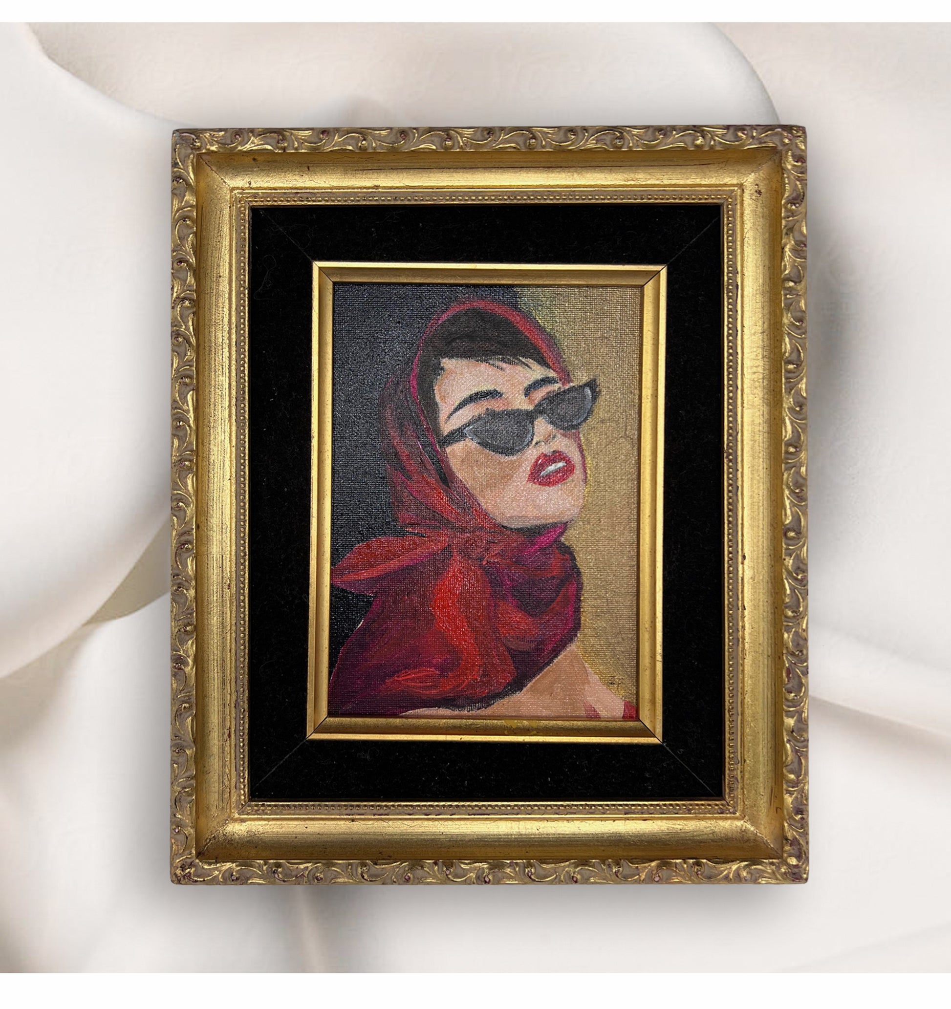 Old Hollywood represents a starlet in the making . Painted in oils and acrylics she is an original in waiting to be discovered.