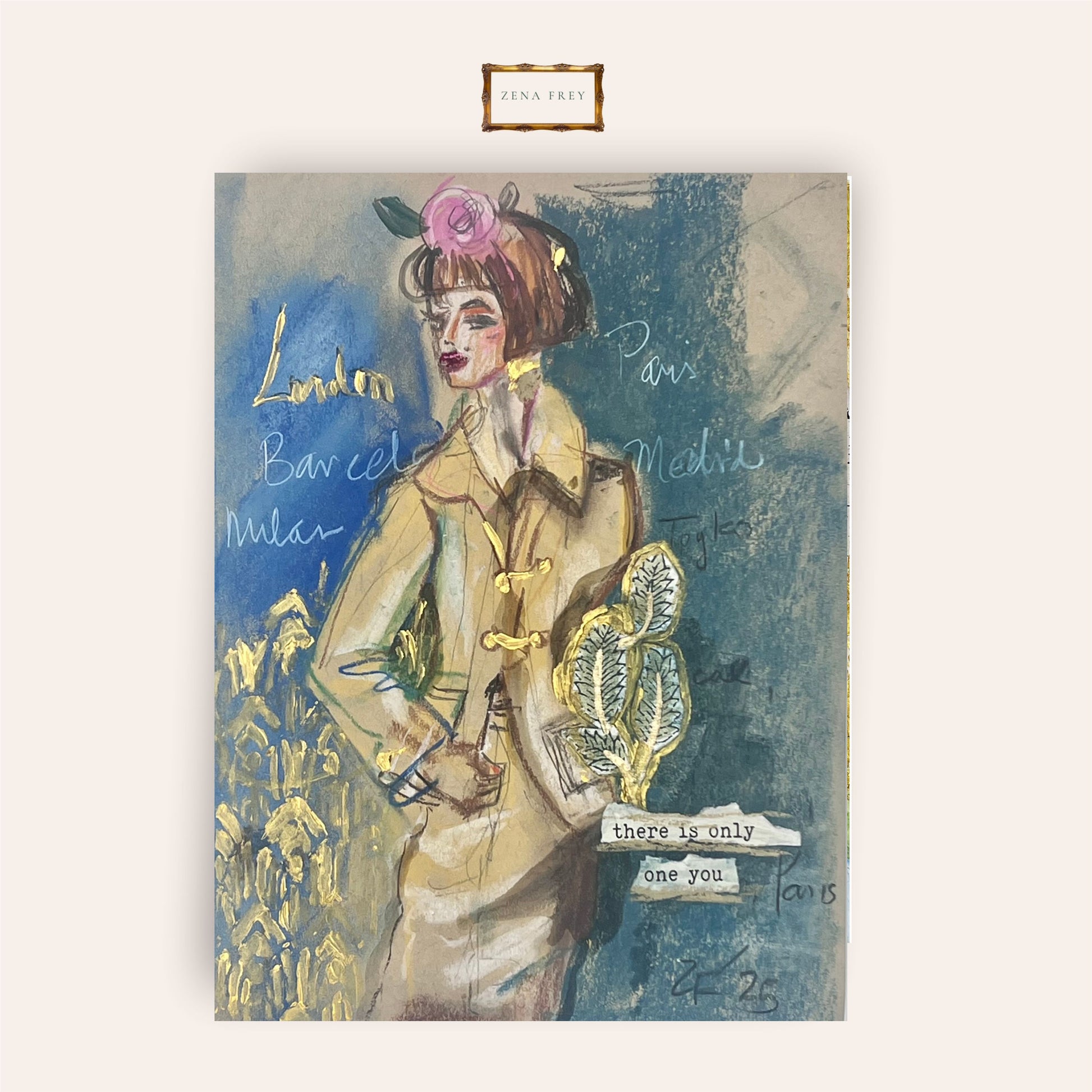 This piece is part of my ongoing series of pastel fashion illustrations, a heartfelt ode to my college days studying fashion in New York City. Each illustration captures the spirit and energy of that formative time- where creativity, style, and self-discovery converged in the city that never sleeps. Rendered in soft pastels and delicate watercolors, the work evokes both nostalgia and timeless beauty of fashion as art. Size of art 9 x 12
