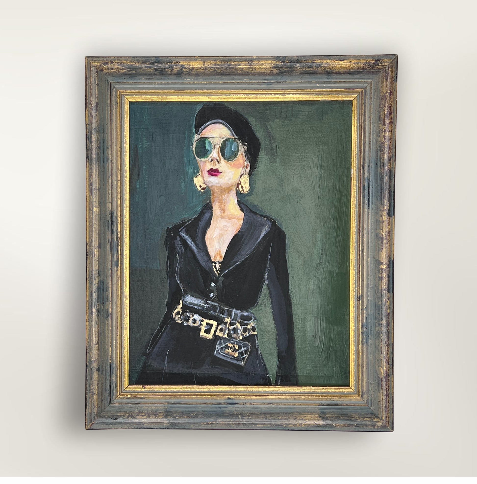 Painted in acrylics with gold leaf accents, this portrait is housed in a vintage frame that complements her timeless aura