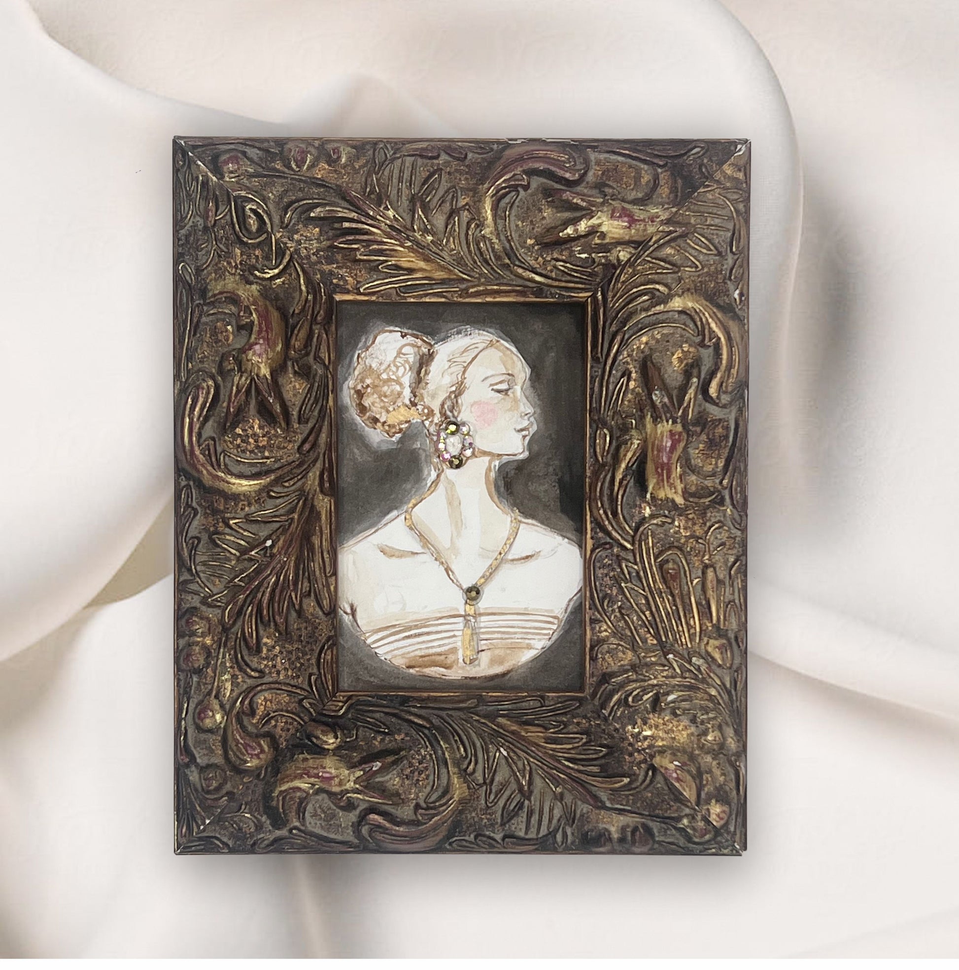 Ruth is one of my favorite pieces-elegant, romantic and full of strength. Painted in watercolors, gold leaf, and features a delicate Swarovski crystal earring as her earring, adding a touch of refined sparkle.