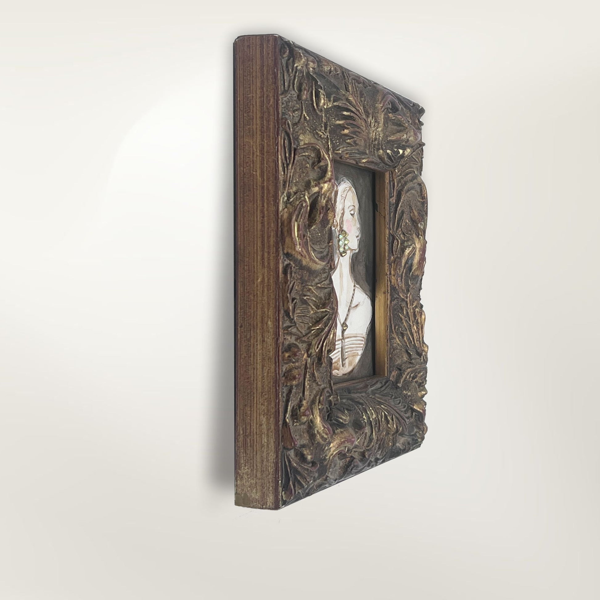 She is housed in a beautifully ornate vintage frame, discovered in an antique shop. The frame measures 9.5 x 7.5 and includes an easel for tabletop display or she can be easily incorporated into your wall gallery.