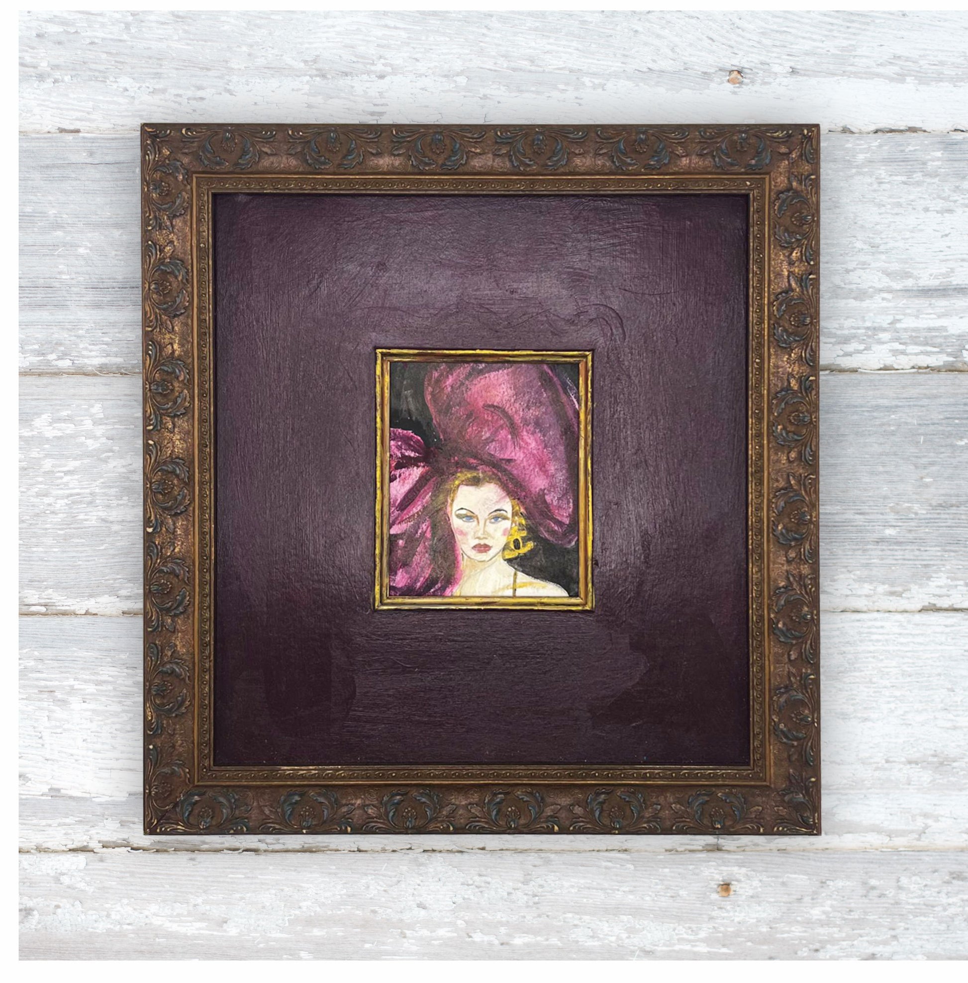 This striking mixed media painting brings high fashion and classic portraiture together in a captivating expression of femininity and style. Painted using a rich combination of acrylics, and gold leaf. Set within a one-of-a kind vintage frame, hand selected from a vintage market, the artwork gains an added layer of history and charm in any room or gallery wall. Piece measures 12 x 12
