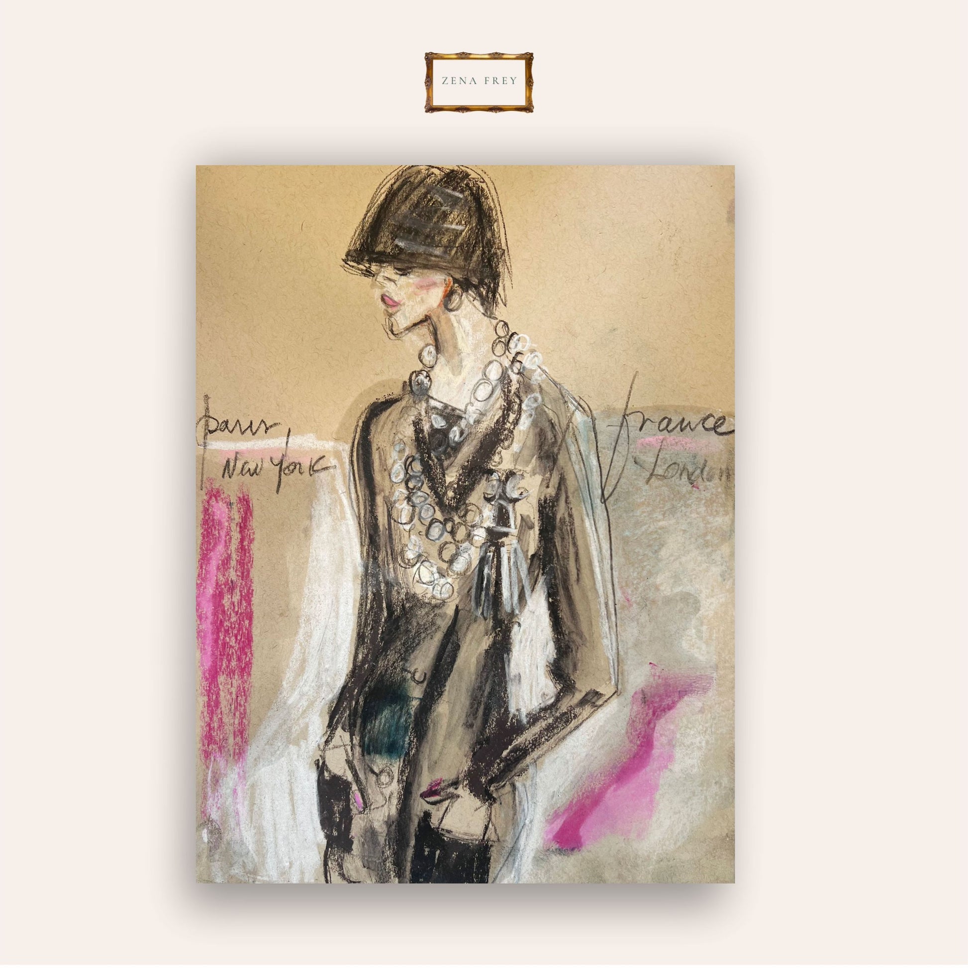 This piece is part of my ongoing series of pastel fashion illustrations, a heartfelt ode to my college days studying fashion in New York City. Each illustration captures the spirit and energy of that formative time- where creativity, style, and self-discovery converged in the city that never sleeps. Rendered in soft pastels and delicate watercolors, the work evokes both nostalgia and timeless beauty of fashion as art. Size of art 9 x 12