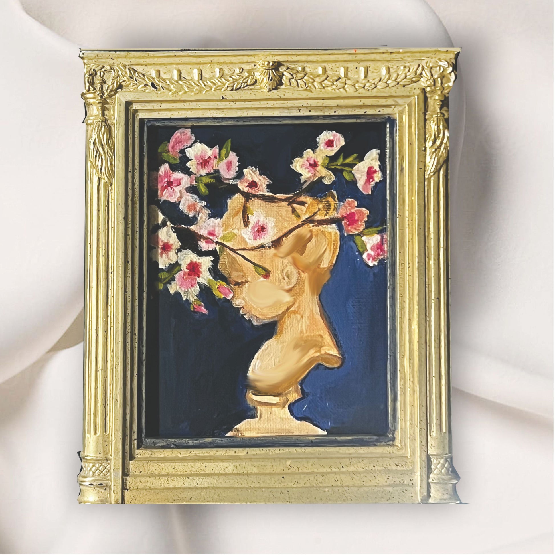 A delicate study in grace and renewal, Blossom Reverie captures the serene classical bust in nature. Painted in rich navy and pink blossoms peach tones, this portrait evokes vintage elegance in its ornate frame.
