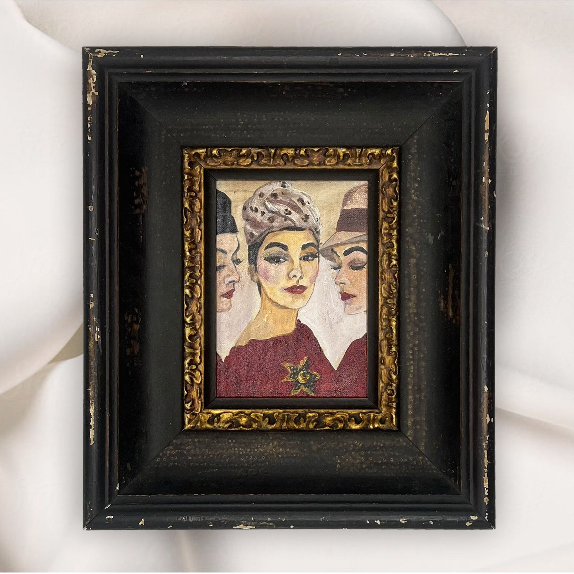 Painted in Acrylics and double varnished and place inside a vintage frame.