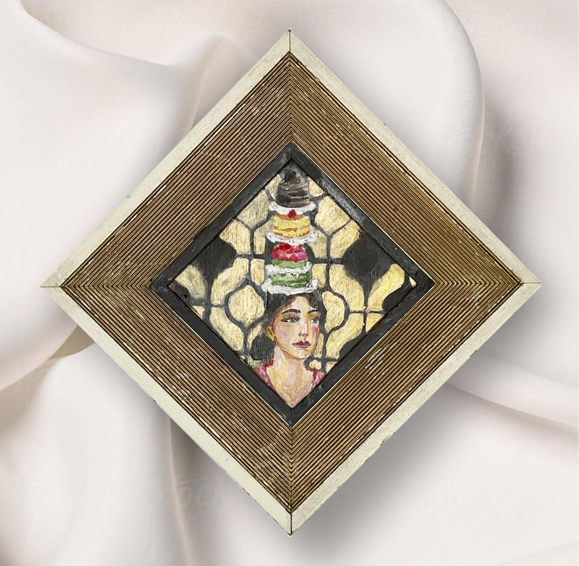 The Pastry Maker balances beauty and burden-a tower of temptations resting slightly upon her crown.