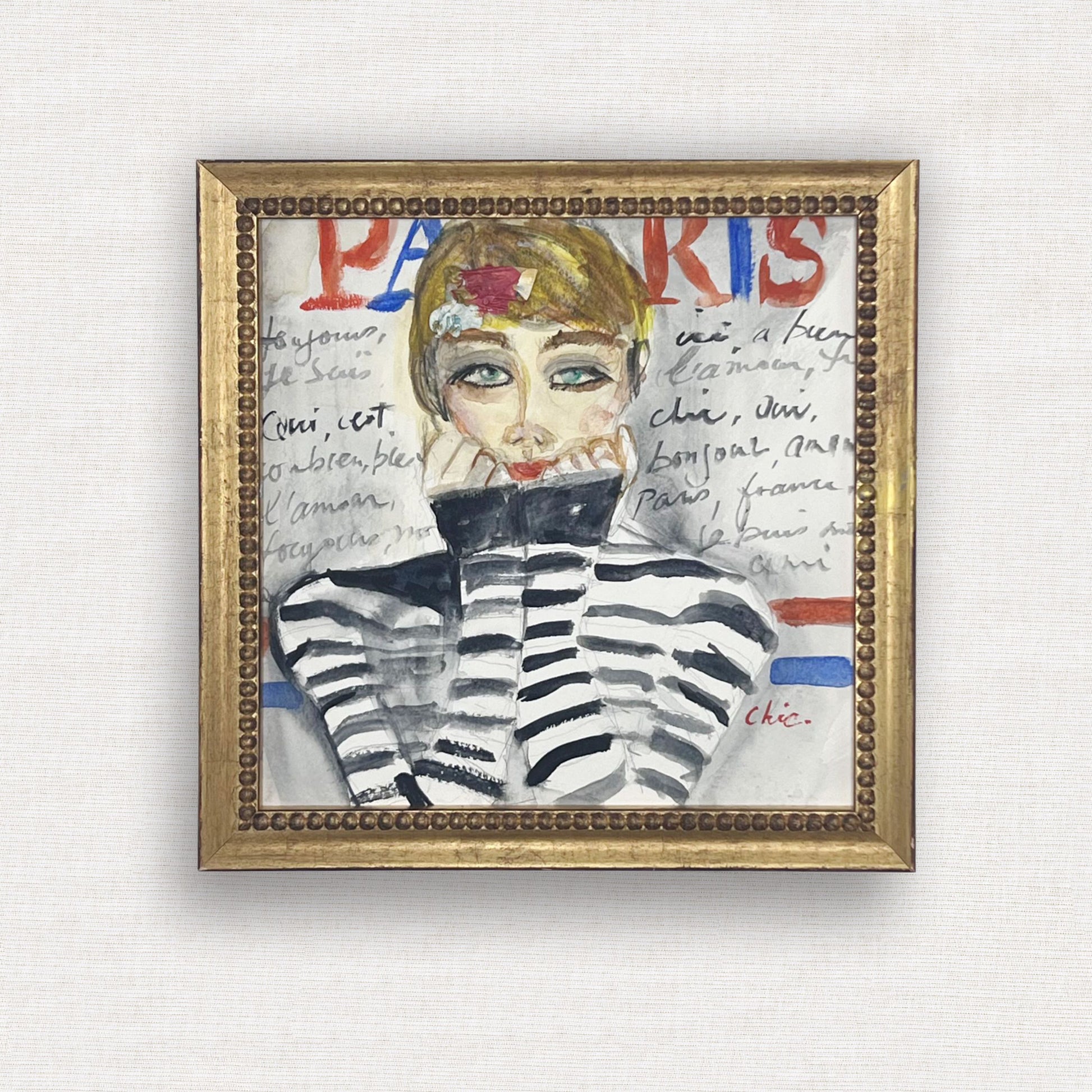 This striking mixed media painting brings high fashion and classic portraiture together in a captivating expression of femininity and style. Painted using a rich combination of acrylics, and watercolors. Set within a one-of-a kind vintage frame, hand selected from a vintage market, the artwork gains an added layer of history and charm in any room or gallery wall. Piece measures 9x9