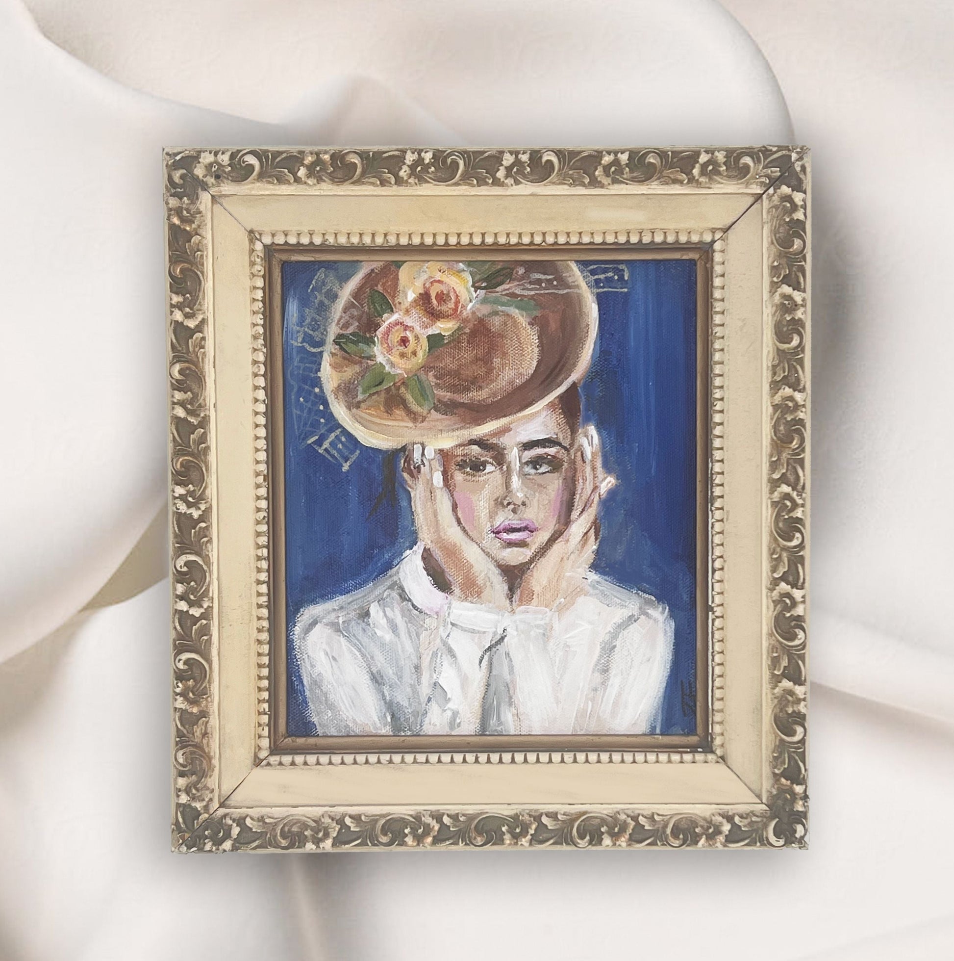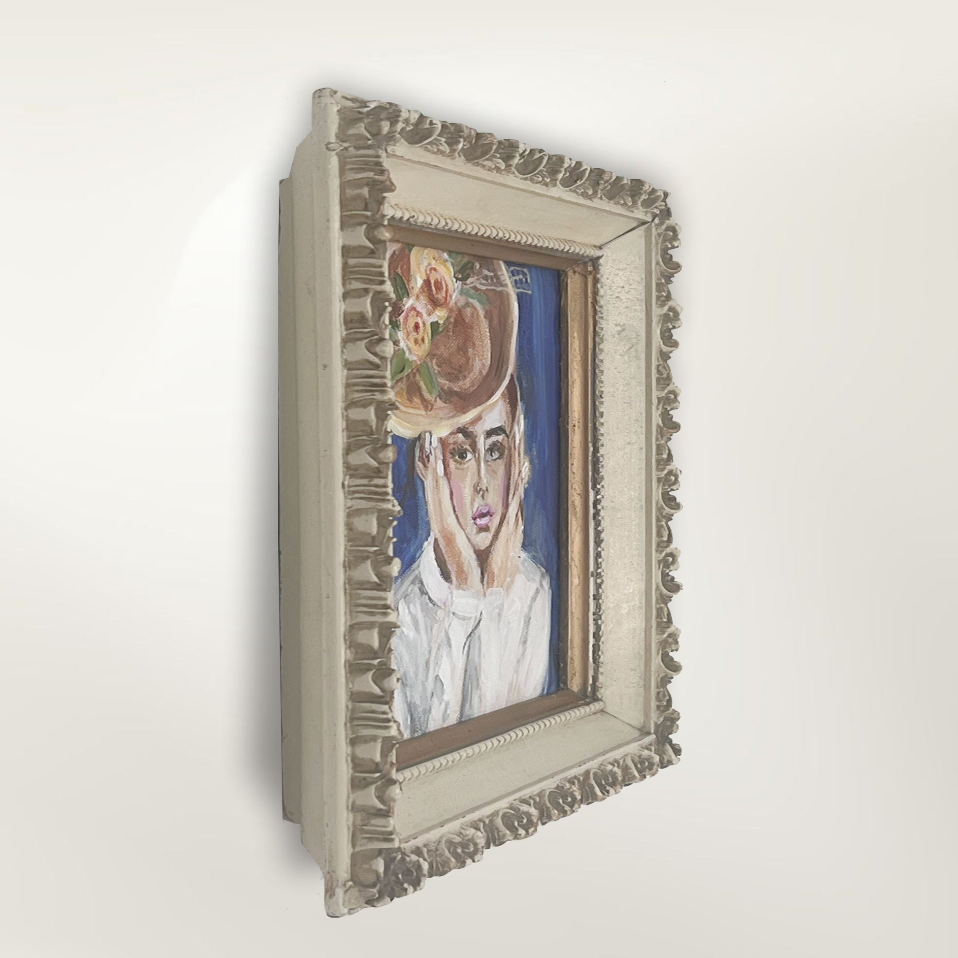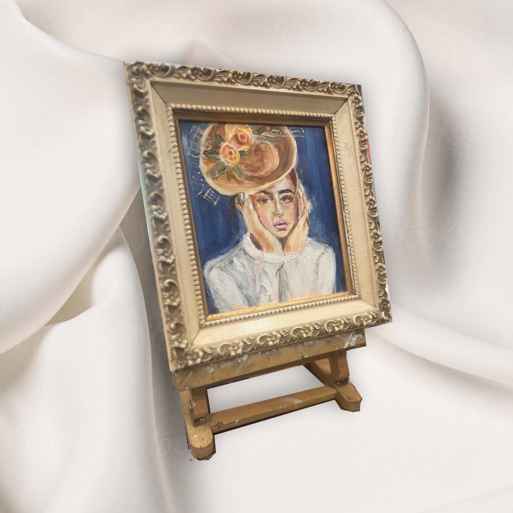 This painting captures the timeless elegance of a young woman from the early 1900's, an era when fashion was defined by elegance and poise. Her hat-a bold statement of the time-crowns her figure with vintage charm, reflecting the sophistication of the period. The portrait is housed in a stunning vintage frame measuring 11 x 10 inches, perfectly complimenting the artwork's historic character.